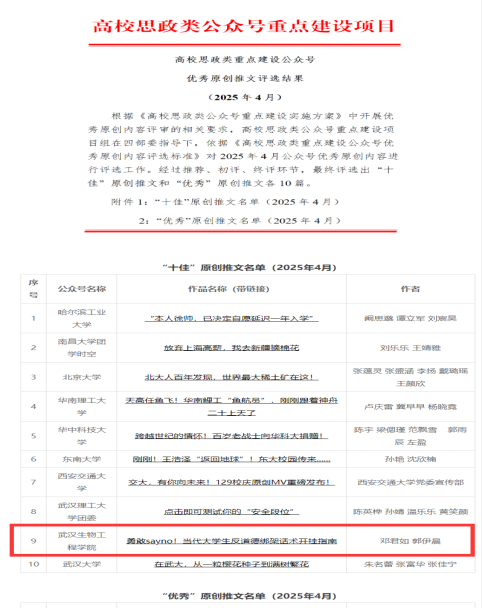该作品聚焦“代签到”“深夜游戏邀约”等六大校园常见“道德绑架”场景及其话术,通过虚拟对话生动呈现应对策略,旨在引导大学生学会合理拒绝、守护个人边界。作品内容紧贴校园生活,兼具实用性与共鸣感,凭借其精准的学生视角设计,最终从全国首批高校思政类重点建设公众号的200余篇原创文章中脱颖而出,成功入选“十佳”原创内容名单。