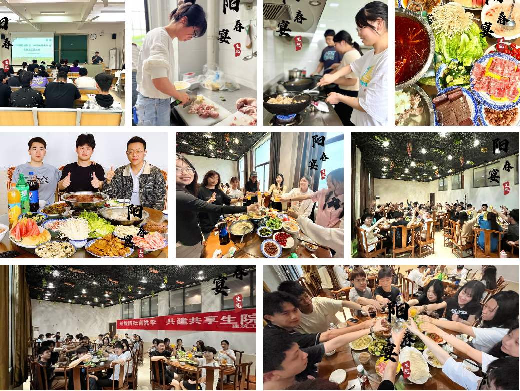 4月18日晚,建筑工程学院2021级280余名学生在生活艺术楼开展以”卅载耕耘育桃李,共建共享生院情”为主题的阳春宴活动。师生们一起参与活动共享美食。在活动开展前,2021级各班陆续开展了阳春宴主题讨论会,班委合理细化工作任务,听取群众建议,制定活动方案,采取师生自主烹饪,自行联欢的方式举行。