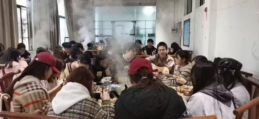 文学院党总支书记、常务副院长黄亚兰,党总支副书记袁宁等与同学们一起围坐共享美食