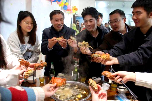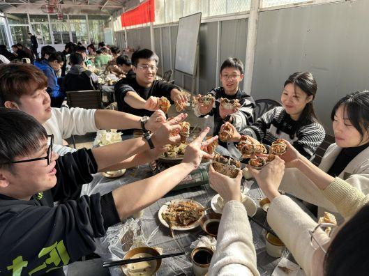11月20日中午12:00管理学院2024届毕业班学生在生活艺术楼举办了蟹鱼宴。邀请马敬桂院长、洪斌书记、邓桉树书记、毕业班全体辅导员老师参加,师生共同烹饪,拉近了彼此的距离。马院长与同学们共同举杯欢庆,给同学们送去美好寄语。同学们举起螃蟹用相机留下合影,享受特色水产美食。
