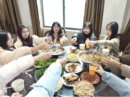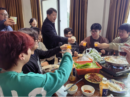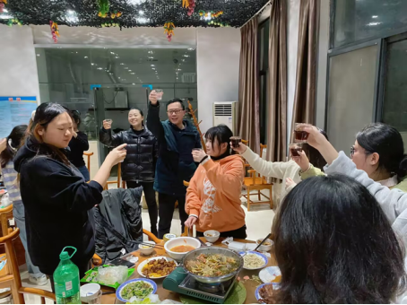 杀鱼、洗菜、起锅、烧油、摆盘,同学们分工明确,各司其职,有条不紊的将自己亲手烹饪的酸菜鱼、土豆烧鸡等一道道美食端出来与大家共享,现场欢声笑语,其乐融融。师生们围坐在一起,一边品尝火锅,一边畅谈职业生涯规划。