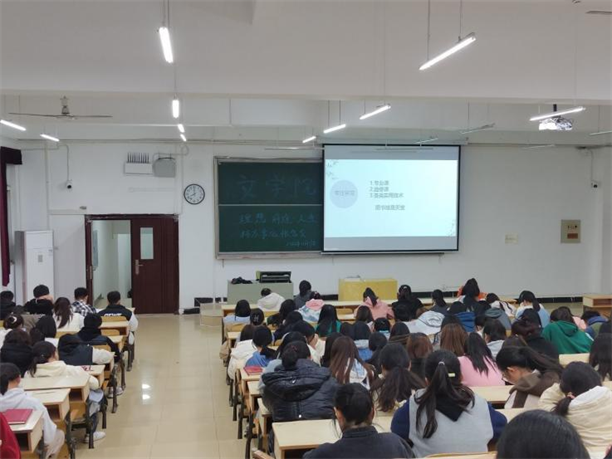 本网讯(通讯员 宋德慧 摄制张妍唐明钰)11月17日晚,为进一步开展新生入学教育,培养具有自立自强品格和精神、创新创业意识和能力的高素质应用型人才,文学院在六号教学楼东方红报告厅举行了“人生赢在双自双创路上”校友事迹分享会,并邀请中南民族大学老师、管理学院2018届校友王卫主讲。学院党总支副书记袁宁、专职辅导员周晚霞及2022级全体新生参加报告会,会议由分团委书记曹利凉主持。