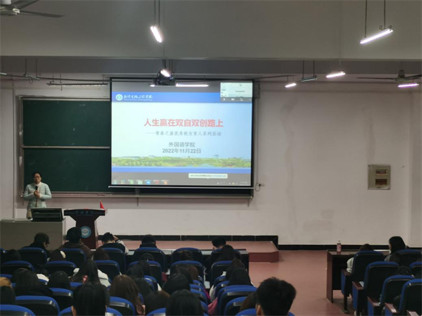 本网讯(通讯员 余子聪 丁子洋)11月22日下午,外国语学院在6号楼西方蓝报告厅举行了“人生赢在双自双创路上”优秀校友报告会,特邀该学院2019届校友、桂林电子科技大学研究生谢丹以线上和线下相结合的方式进行了分享。