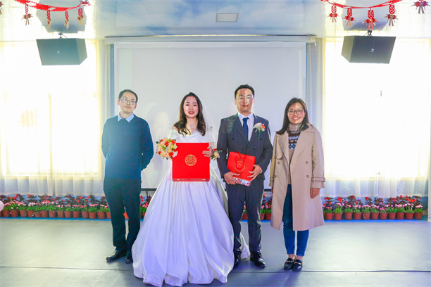 “新娘与新郎相识于晨光湖畔,相熟于图书馆中,在求学旅程中互生情愫,在校园漫步时喜结连理。‘六色’校园,千言万语促成‘吾生缘’起,同心同德,相濡以沫,喜迎携手同行,一生相伴......”生命科学与技术学院院长徐飞教授作为证婚人,他向新人表示最真诚的祝贺。“因四叶草结缘,因武生院如愿”,外国语学院党总支书记、常务副院长周芳教授代表“四叶草”教学团队担任证婚人,她祝愿申仓松、段晓冬两位“终成眷属的有情人”,在人生旅途中相互携手,正如入学年份一样,1314 (一生一世),白头到老。