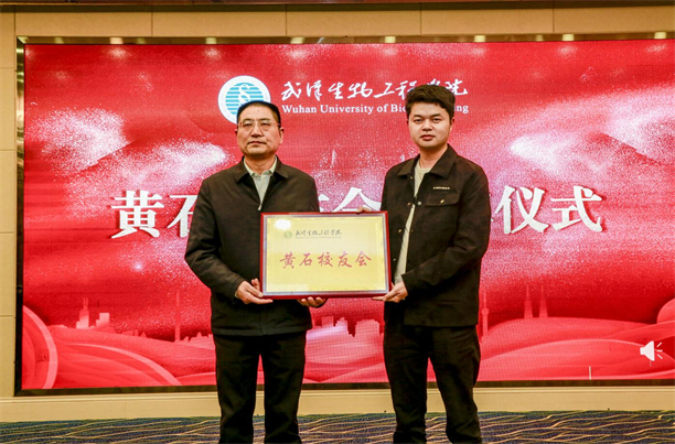 校党委书记江珩(左)为黄石校友会会长孙双华(右)授黄石校友会会牌