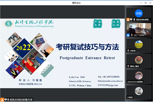 生命科学与技术学院2012届优秀校友、华中师范大学博士、我校青年教师、国家自然科学基金项目主持人刘磊磊首先围绕“考研复试技巧与方法”这一主题,为正在进行复试准备的同学们进行了考情分析,并结合自身经历阐述了复试中需要重视的问题,分享了复试准备的经验,介绍了调剂与补录信息收集等工作的重要性和注意事项。