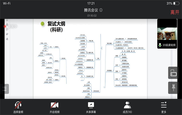 两位2020届的中药学专业校友:广州中医药大学药用植物生理生态研究所周帅奇和广州中医药大学第二临床医学院研究生龚铭炯两位校友向学弟学妹们讲解了选择高校研究所和附属医院硕士研究生的区别,制作了精致而又全面的考研复试大纲,全过程全方位解读了考研复试的每一环节和时间节点,勉励学弟学妹们认真准备、努力拼搏,一起相约“广中药”。