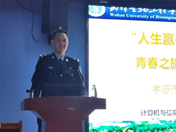 本网讯(通讯员 淳再清)10月27日,计算机与信息工程学院特邀孝感市公安局孝南区分局肖港派出所教导员、四级警长、计信学院2007届校友吴超返校,在15号教学楼307多功能报告厅和9号教学阶1报告厅,分别为2021级新生代表开展了两场专题报告会,学院2021级部分新生代表和全体班干部参加报告会,会议分别由学院党总支书记谭学锋和副书记淳再清主持。