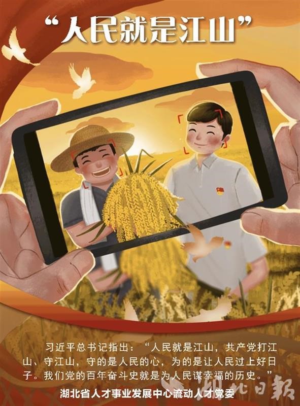 漫画作品《人民就是江山》中,相机定格住了丰收的喜悦。金秋看丰收,画面中的农民头戴斗笠,正举起饱满的小麦和锋利的镰刀,和村干部一起面朝镜头朴实地笑着。漫画底部,是习近平总书记关于“人民就是江山”的具体论述,湖北省人才事业发展中心流动人才党委希望能用这样一种党建教育连载漫画的形式充分讲好党和人民的故事。