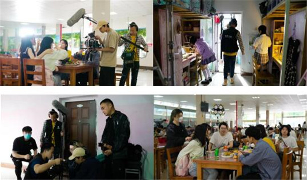 图为拍摄团队在学校食堂、宿舍取景拍摄