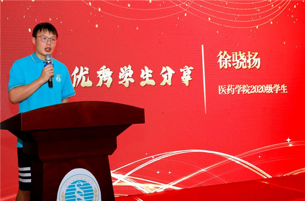 医药学院2020级学生徐骁扬作为优秀学生代表上台发言,表示要以学长学姐们为榜样,脚踏实地走好大学的每一步,做勇于担当、有所作为的新时代青年。
