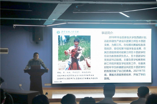 “青春就应该奔赴祖国最需要的地方。”分享会上,黄毅校友以《让青春之花绽放在祖国最需要的地方》为主题,结合自身在疆发展成长的经历、现任岗位的工作情况以及收获和未来打算,向2021级新生们讲述了自己参加大学生志愿服务西部计划和在新疆生产建设兵团第三师五四团学校开展为期三年支教生活的挥洒青春、奉献基层的故事。并鼓励学生们积极参与西部计划,让青春与祖国同向同行,在祖国最需要的地方绽放光彩。