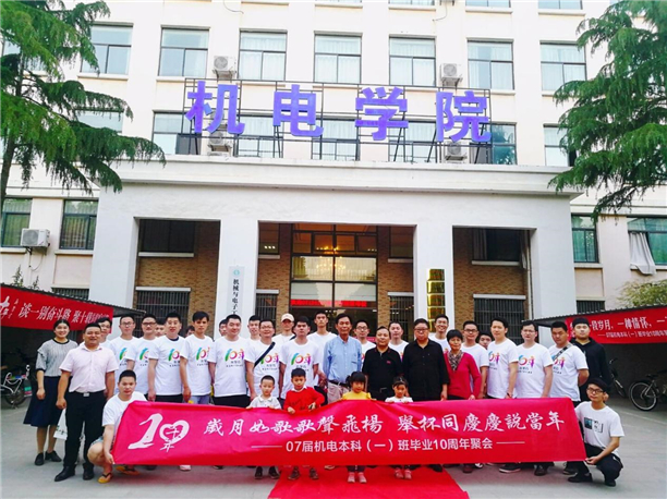 图为该院2007级机械设计制造及其自动化专业本科1班校友在机电大楼前与校领导、恩师合影留恋