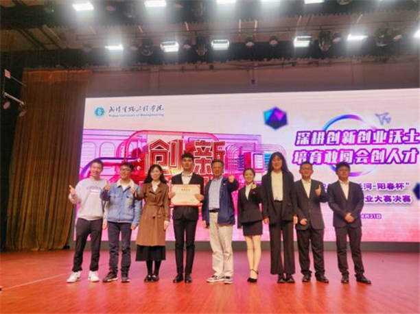 图为斩获武汉生物工程学院2021年度“长河—阳春杯”大学生创新创业大赛金奖后,罗伟(左四)与团队成员在会场合影留念