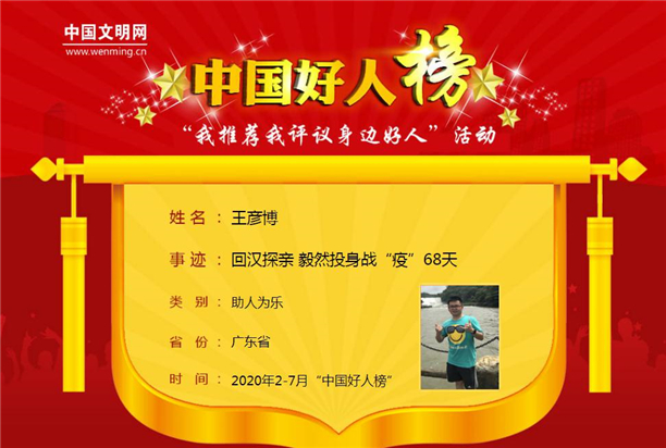 据悉,王彦博校友的战“疫”事迹被《南方日报》《楚天都市报》等多家媒体宣传报道,并被获评中央文明办“中国好人榜-助人为乐好人”、广东省文明办“广东好人”、珠海市文明办“抗击疫情先进志愿服务先进典型”等荣誉称号。
