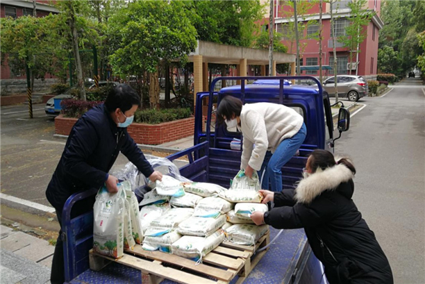 据了解,疫情爆发后,赵敬校友就一直关注武汉疫情及母校的情况,通过浏览校园网,她得知学校实行封闭管理,老师们的生活物资都需要定期采购来维持供应,便随即在家乡采购了当地特产“瓦仓大米”1000斤。由于当时湖北物流限制导致物资不能送到学校,赵敬校友就一直等待时机,终于,4月8日武汉正式“解封”,赵敬校友立即办好相关手续,并联系车辆亲自将物资运送到母校。