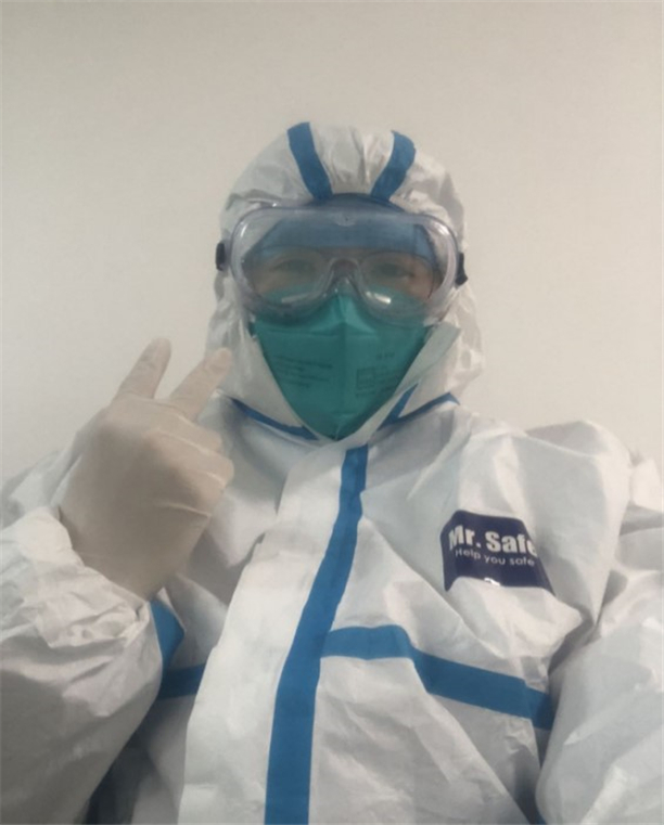 图为袁田穿着防护服工作的照片