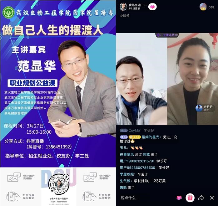 本网讯(通讯员 肖亚慧)3月27日下午,由学校招生就业处、校友办和学工处指导,药学院承办的“药院星播客”通过抖音平台开展了一堂名为“做自己人生的摆渡人”的职业规划公益课,该课程邀请到药学院2007届校友、武生院校友企业家俱乐部理事、武汉市福泽万家健康咨询服务有限公司创始人范显华担任主讲嘉宾,药学院全体无课师生观看了直播。