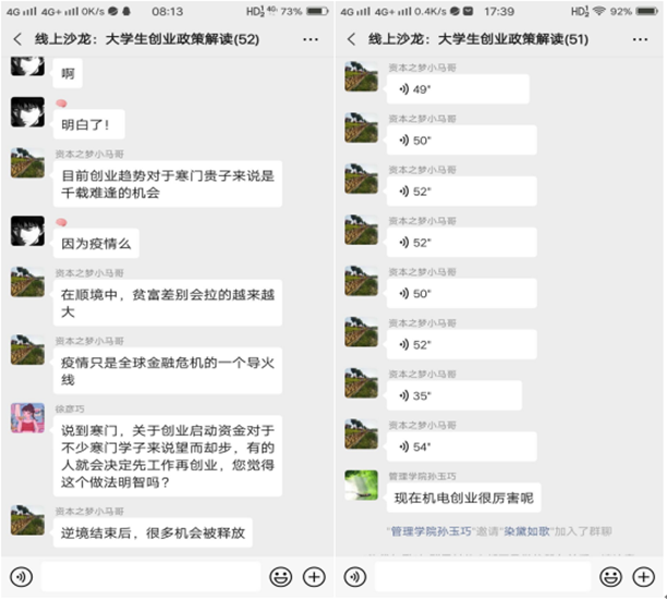 本网讯(通讯员 陈醒)4月8日,管理学院特邀市场营销专业2015届校友、武汉银江创业梦工厂企业管理有限公司总经理、两只兰屯科技服务(武汉)有限公司执行董事、创享+武汉园区执行总经理马山成,在微信群内进行直播,为该院创客们进行创业政策解读。活动由管理学院党总支书记孙玉巧主持。