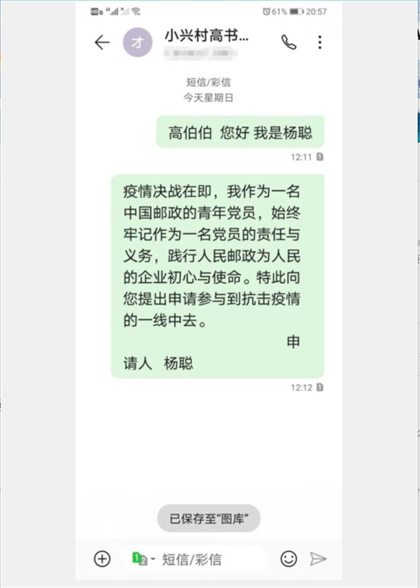 图为杨聪校友向当地党组织申请参加抗疫工作短信