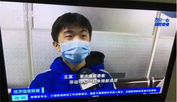 图为中央电视台播发王勇捐献血浆后接受记者采访画面