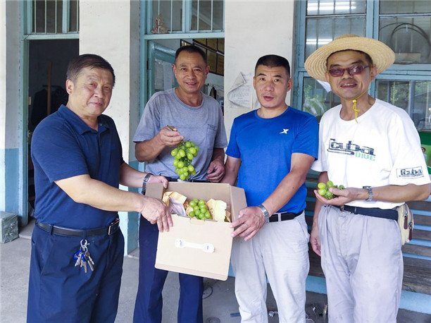 本网讯(记者 任丽琼 摄影 陈冲)“葡萄真甜呀”“校友送的清凉真温暖”……8月21日上午,铁木加工厂、校园园林绿化建设与管理中心、学生公寓等单位暑期坚守岗位和参加校园建设的师生员工收到一份特殊的高温慰问——优质葡萄“阳光玫瑰”。
