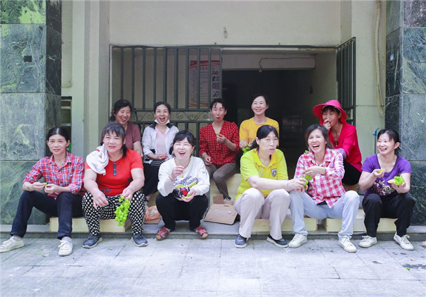 图为在工作间隙,大家围坐在一起品尝“阳光玫瑰”