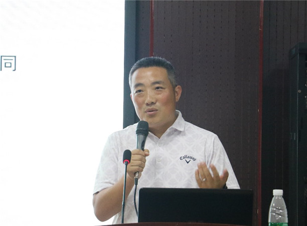 郭春同具有丰富的园林设计及施工经验,尤其擅长现场植物设计造景。他先后成立了武汉春如意园艺有限公司、武汉筑春园林景观艺术有限公司、武汉园中春园林景观工程有限公司,在咸宁、武汉东西湖投产400亩草坪基地,主要生产经营高档绿化用草及运动场草皮。图为郭春同分享发言