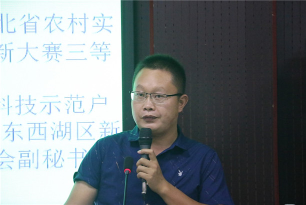 武汉玉福农业发展有限公司主要从事蔬菜、食用菌种植,蔬菜规模达200亩。该公司总经理聂启明被推选为武汉市东西湖区新型职业农民协会副秘书长,先后获得“武汉市核心科技示范户”荣誉称号和湖北省农村实用人才创意创新大赛三等奖。图为聂启明分享发言