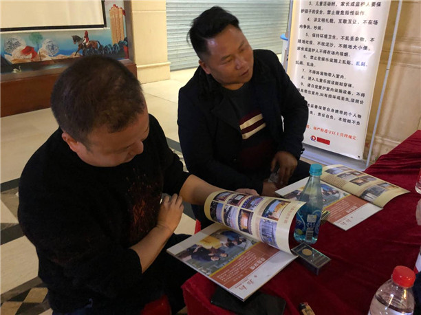 图为两位校友观看学校最新宣传手册