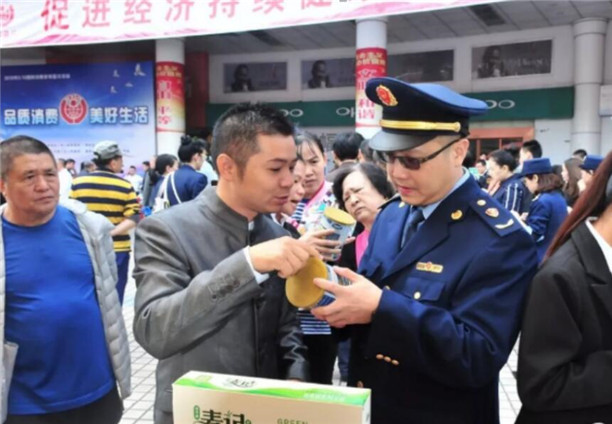 图为在海口市工商行政管理局、美兰区政府联合举办的3·15“国际消费者权益日”纪念活动上,吴清杰(左)向海口市工商行政管理局领导介绍企业产品
