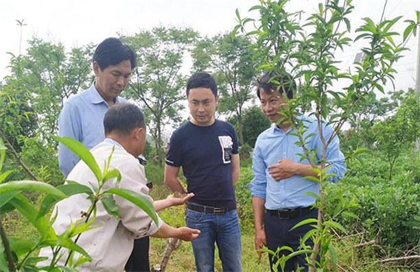图为“桃树大王”、产业教授许先平向武生院理事长余毅、科技处处长袁飞荣和剅河镇党委书记夏达学介绍仙桃一号的水肥土田间管理和去年桃树嫁接的有关情况