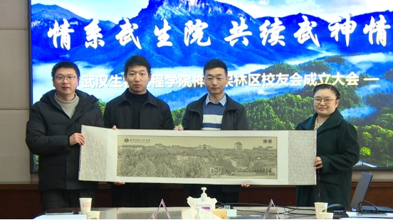 建筑工程学院毛小敏教授向(右)为神农架校友会赠送纪念品——“生院山水”作品