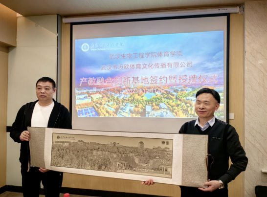 本网讯(通讯员 谭玉春 摄影 胡慧文)12月14日上午,副校长李斌成率领招生就业处、校友办、体育学院有关负责人赴武汉市迈欧体育文化传播有限公司就进一步推进校企合作、提高人才培养质量等进行了座谈交流,并举行学校产教融合创新基地签约暨授牌仪式。武汉市迈欧体育文化传播有限公司董事长孟令华等人参与相关活动。