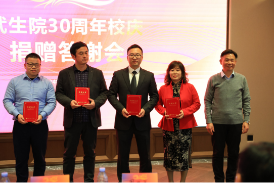 副校长、校友总会副会长李斌成(右一)为校友代表颁发捐赠证书