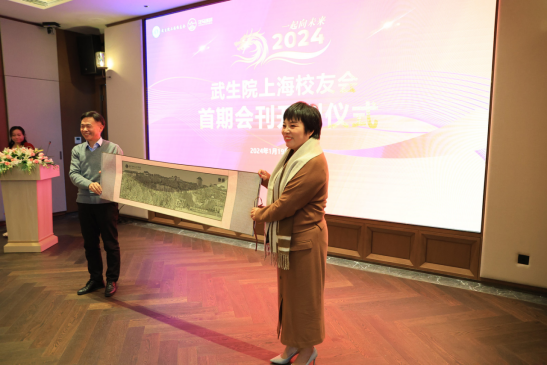 副校长、校友总会副会长李斌成(右一)代表学校向上海校友会赠送皮雕画