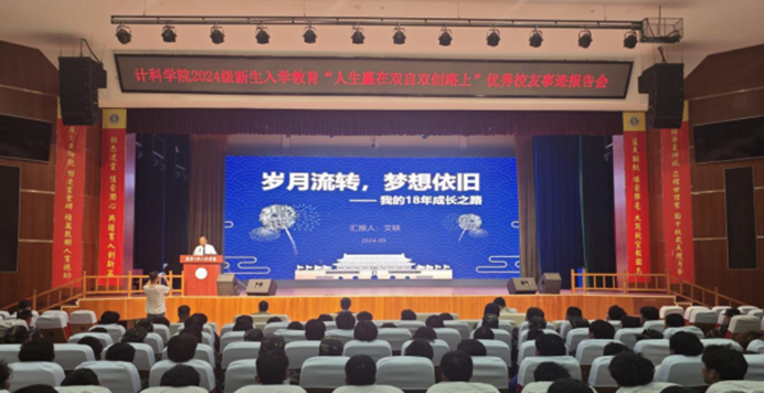 (通讯员 王龙维)为充分发挥优秀校友榜样引领作用,帮助2024级新生树立明确目标并坚定奋斗决心,计算机科学与技术学院于9月20日下午15:00在大礼堂举办了“人生赢在双自双创路上”青春之旅优秀校友事迹报告会,报告会由学院党总支副书记袁宁主持。