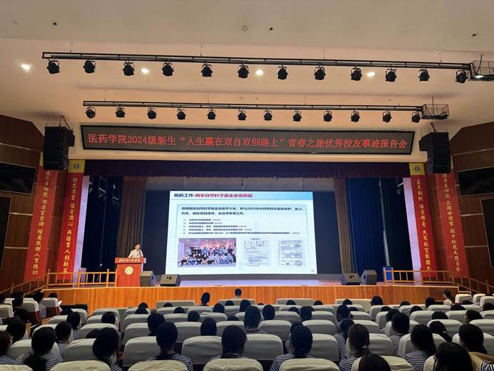 本网讯(通讯员 任高原)9月15日上午,医药学院在学校大礼堂举办了“人生赢在双自双创路上”青春之旅优秀校友事迹报告会,同届、同专业、同在暨南大学药学院工作的校友徐东升副教授和邹剑副研究员应邀为学弟学妹们开讲解惑。副校长柯贤炳教授出席活动,医药学院常务副院长黄帅及全体24级师生聆听分享,报告会由医药学院党总支常务副书记史丹主持。