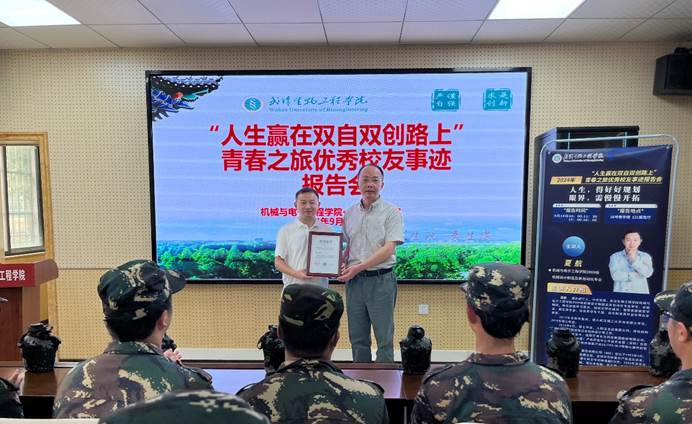 机电·软件学院校友会会长、学院院长张予川教授为夏航校友颁发2024级新生“人生赢在双自双创路上”青春之旅优秀校友事迹报告会主讲人证书。