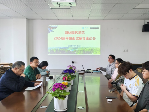 本网讯(通讯员 王子怡)为了更好地服务2024届考研学子,提高研究生复试成功率,园林园艺学院于3月21日下午在园林楼5201会议室采用线上线下结合方式,召开了2024届考研面试辅导座谈会。园林园艺学院院长陈中义、党总支副书记张群慧、教师代表及考研过线学生出席座谈,会议由党总支副书记张群慧主持。