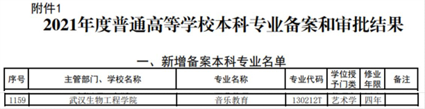 (通讯员洪欢)日前,教育部公布了2021年度普通高等学校本科专业备案和审批结果(教高函〔2021〕14号),我校新增“音乐教育”专业,将于2022年开始招生。