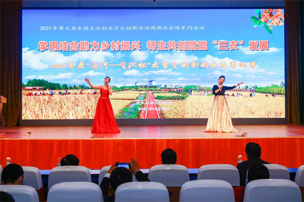 大赛中场间歇,学校青年音乐老师李沐溪、秦嘉璐登台献艺,为现场师生演唱了《水调歌头·游泳》《梦想星光》等经典歌曲,为现场师生带来了一场创业与梦想的激情盛宴。