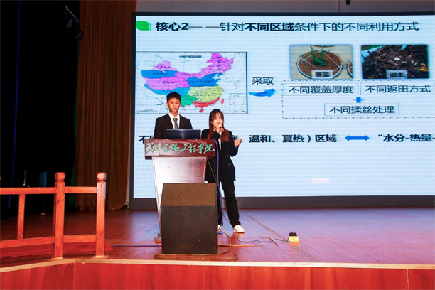 第二赛道金奖项目、化学与环境工程学院·食品科技学院学生翁艺精团队的《变“秸”为宝--农废秸秆资源化利用》依据“变秸为宝,科学返田;取之于农,反哺于农”的核心理念,以“农废秸秆”为原材料,采用“秸秆揉丝、科学还田”等方式,实现农废秸秆资源化利用。