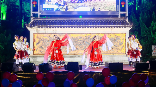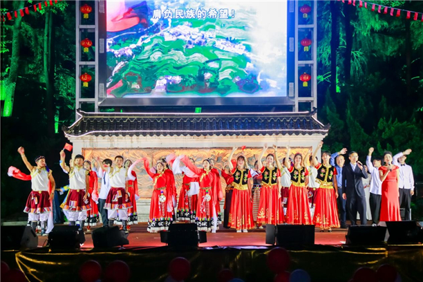 2021级藏族新生次仁措姆与校园十大歌手陈倩、董浩宇共同演唱《唱支山歌给党听》,全体新生自发起立合唱