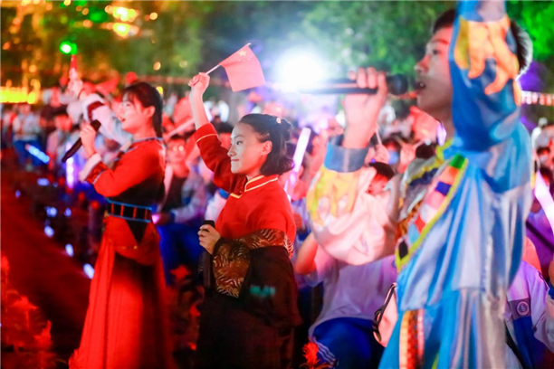 晚会现场流光溢彩、歌声嘹亮,台下观众纷纷舞动着手中的国旗、荧光棒,拿出手机拍照、录像,记录下这红色的海洋、这美好的夜晚。绚烂的灯光和观众们手中的小国旗交相辉映,宛若漫天的繁星,星星点点留在所有人的记忆深处。