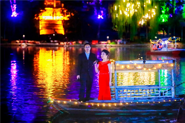 李沐溪、胡琳媛、秦嘉璐、李庚四位青年音乐老师表演歌伴舞《共筑中国梦》。图为李庚(左)、胡琳媛(右)在晨光湖小舟上深情献唱