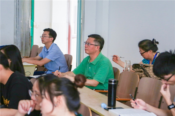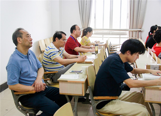 图为常务副校长顾豪爽教授(左一)认真聆听药学院熊大维老师的《药事管理学》课