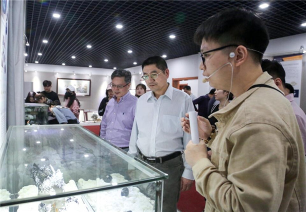 图为校党委书记江珩(中),副校长李毅(左一)等师生代表参观毕业设计作品展