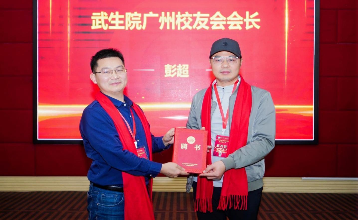 学校校友办参事员、医药学院常务副院长黄帅为当选会长彭超颁发聘书