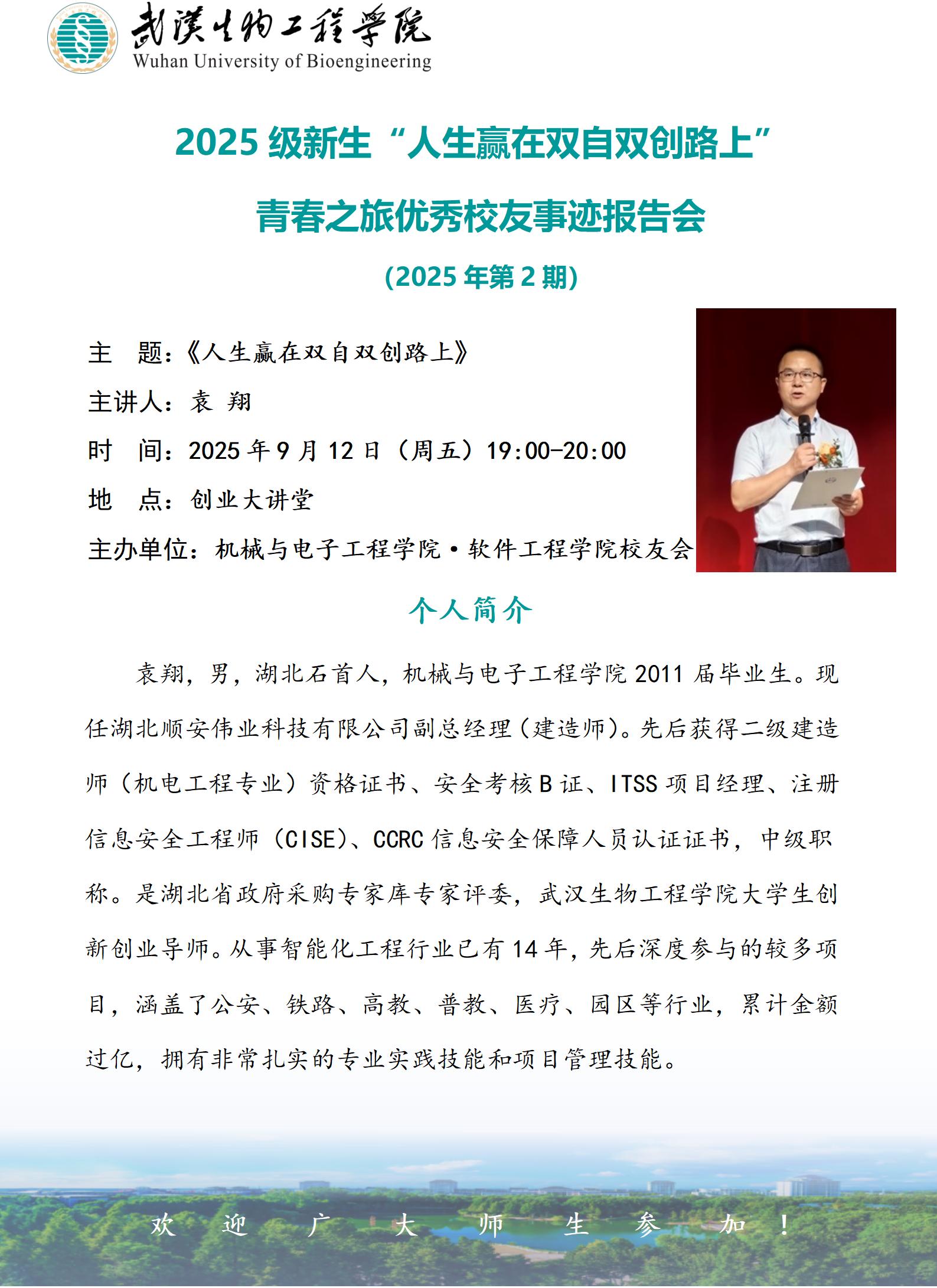 上一条:【双自双创】熊奕凡作题为“学涯规划与考研经验分享”优秀校友事迹报告会的预告 下一条:武汉生物工程学院2026届毕业生秋季校友企业专场招聘会邀请函